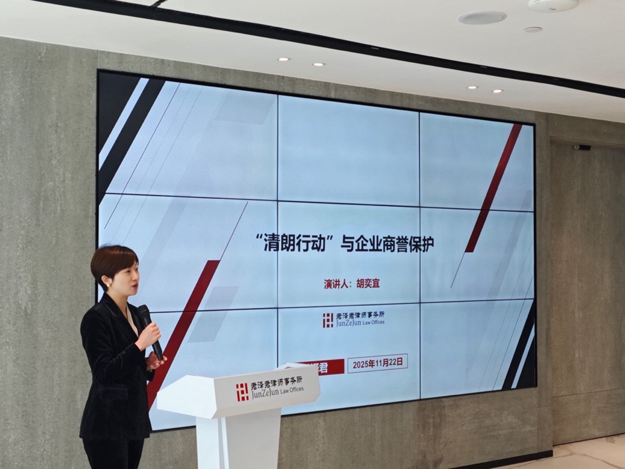会议上,君泽君广州分所合伙人胡奕宜作《“清朗行动”与企业商誉保护》主题分享,向与会嘉宾介绍了自身办理的“最高院保护民营企业和企业家合法权益典型案例”“广东省高院贯彻实施民法典典型案例”等企业商誉维权案件。胡律师同时介绍了君泽君为响应企业商誉维权需求而成立的舆情处置团队及团队的各项专业服务。