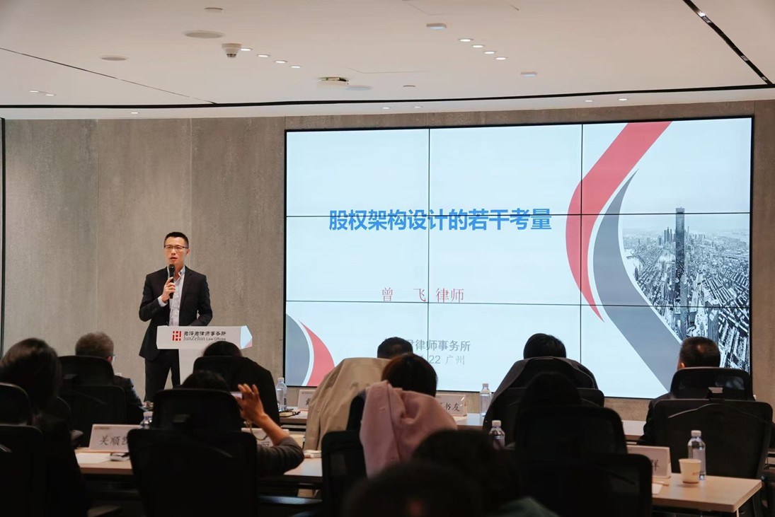 君泽君广州分所律师曾飞作《公司股权架构设计的考量因素》主题分享,结合自身多年为国内外企业担任法律顾问的经验,分别介绍了境内架构、境外架构、外资架构的特殊考量、股权激励机制、家事因素等其他考量场景,强调了企业对股权架构作预先安排的必要性。