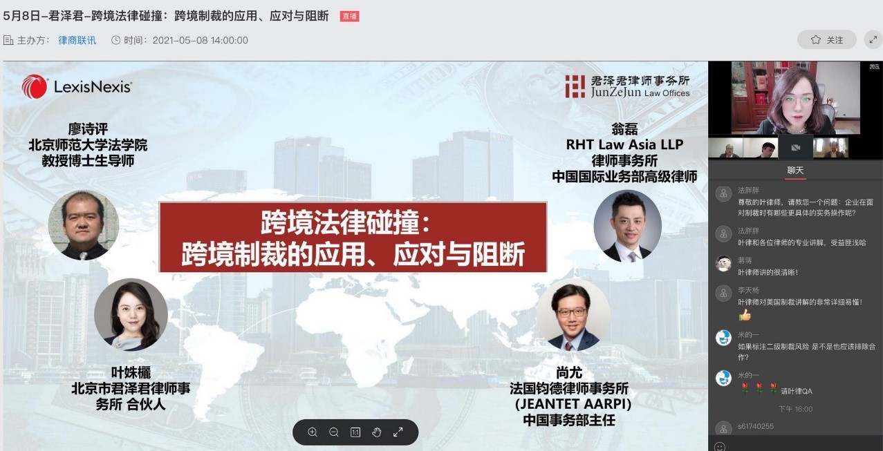 近年来,时有发生的外国法律与制裁措施对中国企业的不当域外适用宛如面向中国企业伸出的“拳头”,其中不乏中国企业因外国出口管制及经济制裁而遭受损失、蒙受损害的案件,而在当前的国际经贸局势下,这种态势在一定时期内仍可能延续。在这一背景下,2021年5月8日,律商联讯与北京市君泽君律师事务所联合举办了题为“跨境法律碰撞:跨境制裁的应用、应对与阻断”的线上研讨会,君泽君律师事务所合伙人叶姝欐律师团队邀请到了来自中国、法国、新加坡三国的律师及学者对跨境制裁相关热点、前沿法律问题进行探讨交流,并在会上重磅发布了由叶姝欐律师团队主笔的包含12国出口管制及制裁相关重点法律法规介绍与解读的《出口管制合规报告及实务参考指南》。