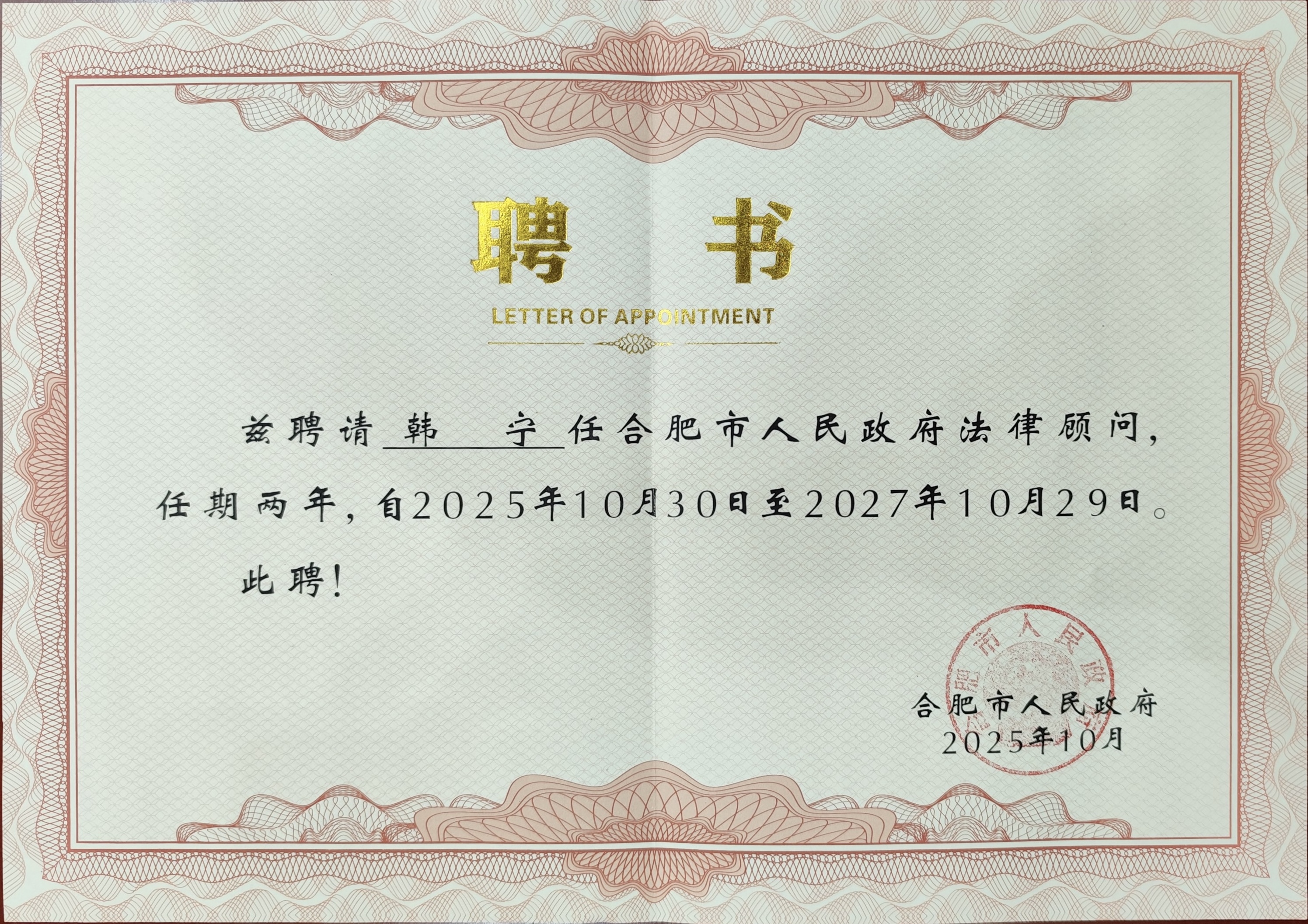 2025年11月21日上午,合肥市政府法律顾问及行政复议委员会委员聘任活动在市政务中心举行。市长罗云峰出席活动并讲话。聘任活动上,宣读了新一届市政府法律顾问及第五届行政复议委员会非常任委员名单,市长罗云峰为北京君泽君(合肥)律师事务所主任、合伙人韩宁律师颁发聘书。罗云峰指出,建立市政府法律顾问制度和行政复议委员会,是开展依法行政、建设法治合肥的重要支撑。