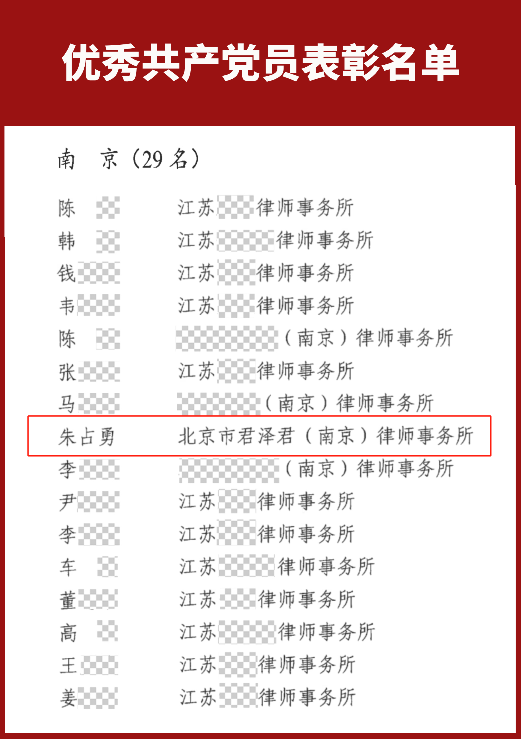 近日,为表彰先进、加强正面宣传,强化典型示范、弘扬主旋律,引领全省律师行业高质量发展走在前列,中共江苏省律师行业委员会发布《关于表彰全省律师行业先进党组织、优秀共产党员、优秀党务工作者的决定》,北京市君泽君(南京)律师事务所党支部书记、合伙人朱占勇律师荣获“全省律师行业优秀共产党员”表彰。