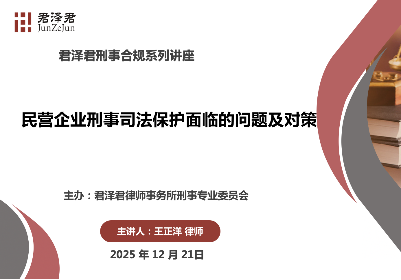 2025年12月21日下午,由君泽君律师事务所刑事专业委员会主办的“民营企业刑事司法保护面临的问题与对策”主题沙龙在上海成功举行,本次沙龙聚焦民营企业刑事风险防控与司法实践,旨在通过案例解析与专业研讨,为企业构建系统化合规管理体系提供务实指引。北京市君泽君(上海)律师事务所高级合伙人王正洋律师担任主讲嘉宾,围绕《刑法修正案(十二)》的制度突破与司法适用,结合君泽君多个成功案例,深入剖析了当前民营企业在刑事司法保护中面临的现实困境与破局路径。
