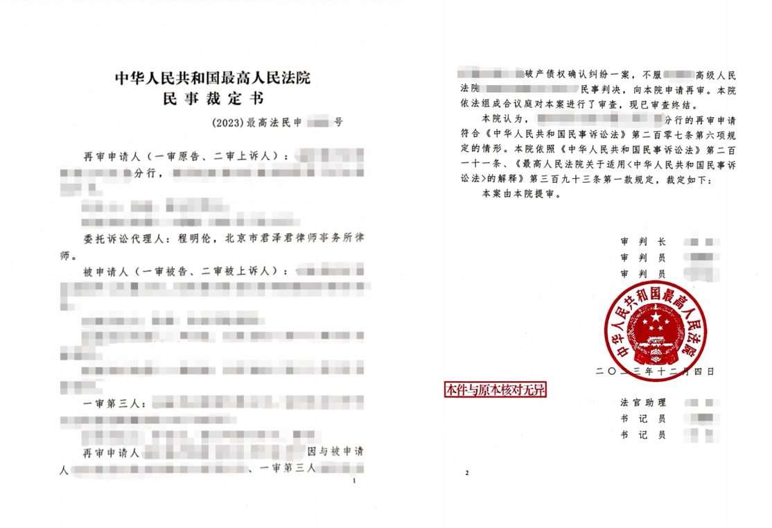 君泽君助力金融机构化解巨额担保债权风险,最终由最高院提审并调解成功