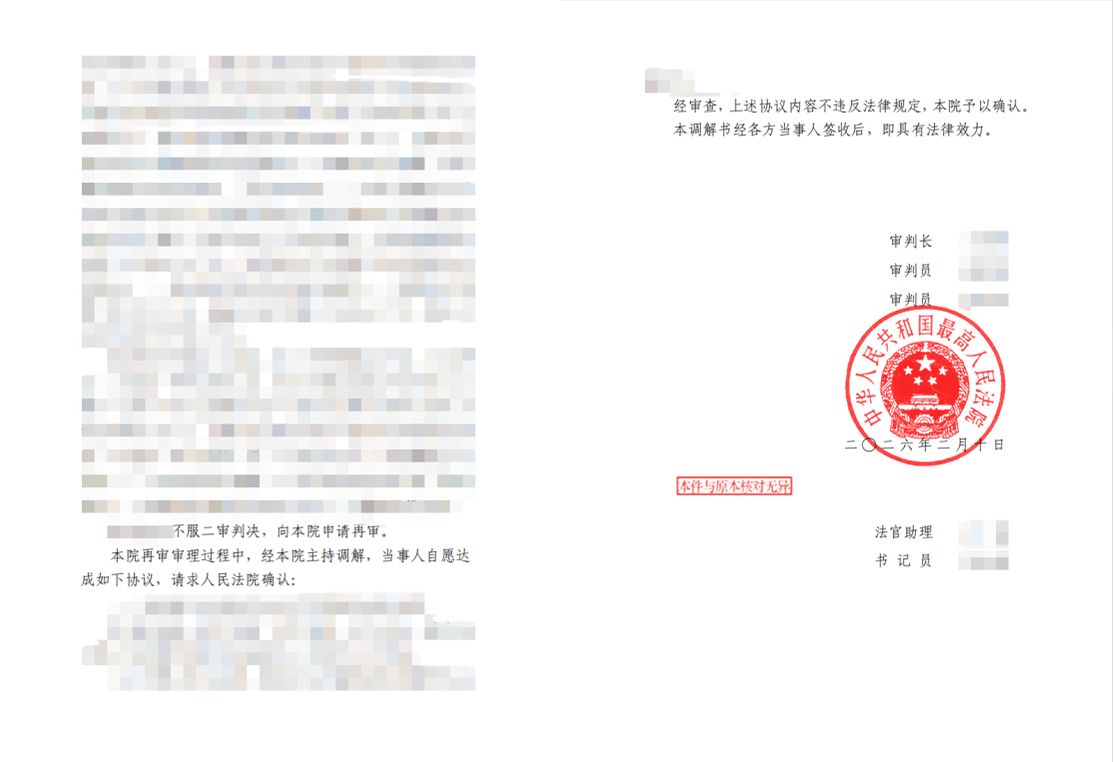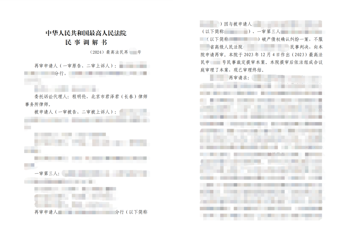 进入再审审理阶段,君泽君律师团队并未局限于单纯的诉讼胜诉目标,而是结合案件涉及上市公司治理、破产程序债权人平等保护等多重维度,敏锐判断机械等待判决可能带来的周期及执行风险。团队在出具充分专业法律意见的基础上,协助委托人确定兼具合法性与实操性的调解方案,最终促成各方达成一致。最高人民法院正式出具民事调解书,确认调解协议效力,为委托人争取到覆盖范围更广、清偿预期更优、履约保障更强的实质性债权实现路径,成功帮助委托人摆脱债权优先权落空的困境。