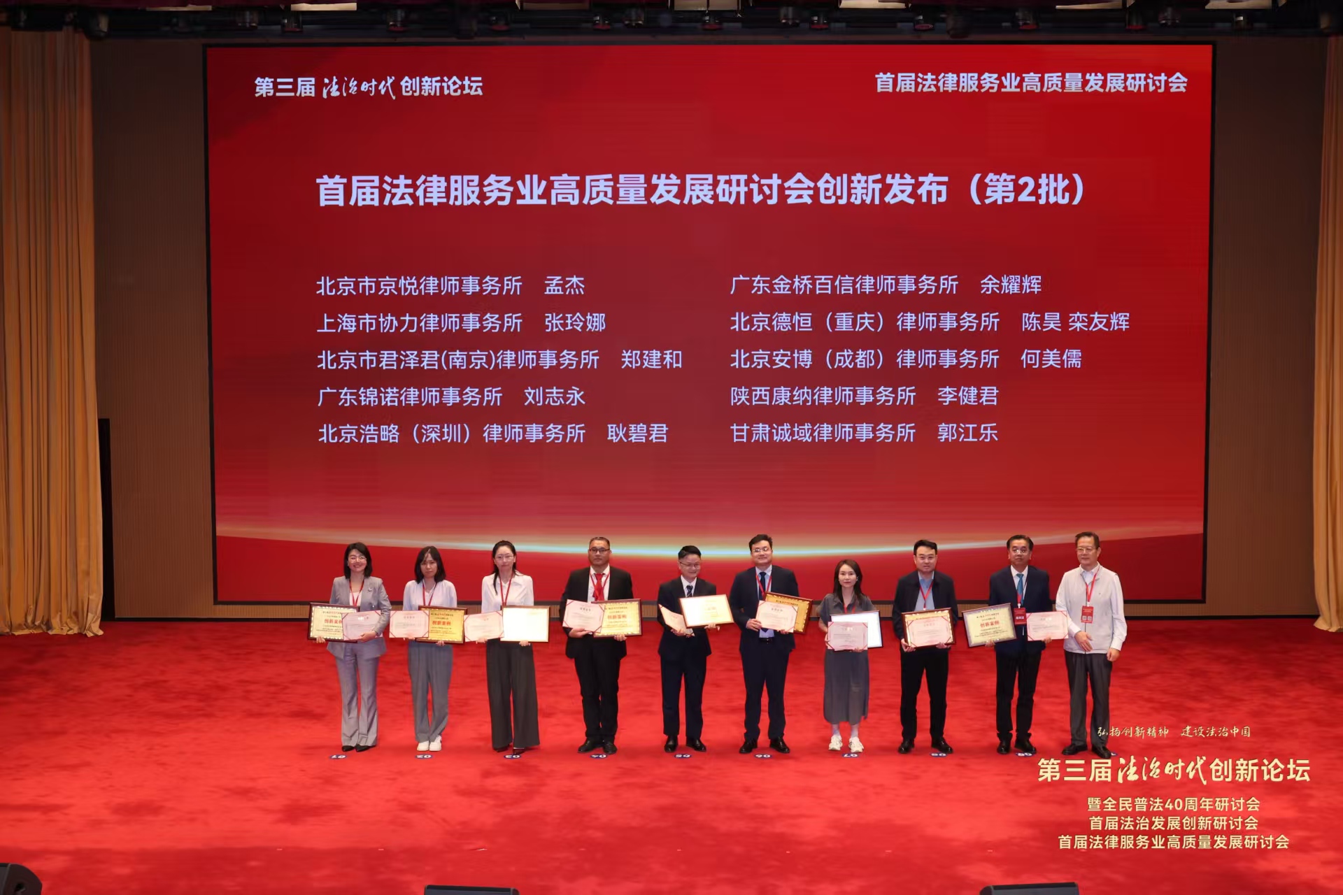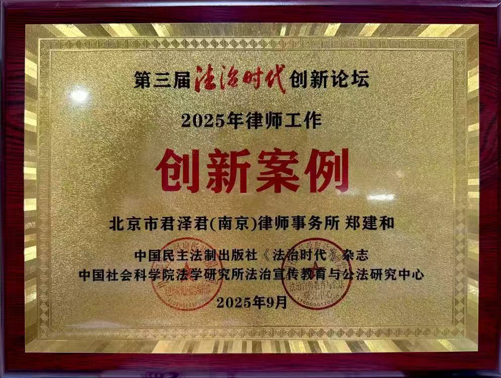 2025年9月20日,由中国民主法制出版社和中国社会科学院法学研究所联合主办的第三届法治时代创新论坛暨全民普法40周年、首届法治发展创新、首届法律服务业高质量发展研讨会在北京成功举办。北京市君泽君(南京)律师事务所申报的“乡村振兴与破产法治宣传”案例,荣获“2025年律师工作创新案例”。