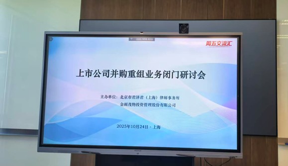2025 年 10 月24日,由北京市君泽君(上海)律师事务所、金雨茂物投资管理股份有限公司联合主办的 “上市公司并购重组业务闭门研讨会”,在北京市君泽君(上海)律师事务所成功举办,本次活动也是“周五交流汇”的系列活动之一。君泽君上海分所高级合伙人王梦静律师、合伙人张艳律师出席了本次研讨会。