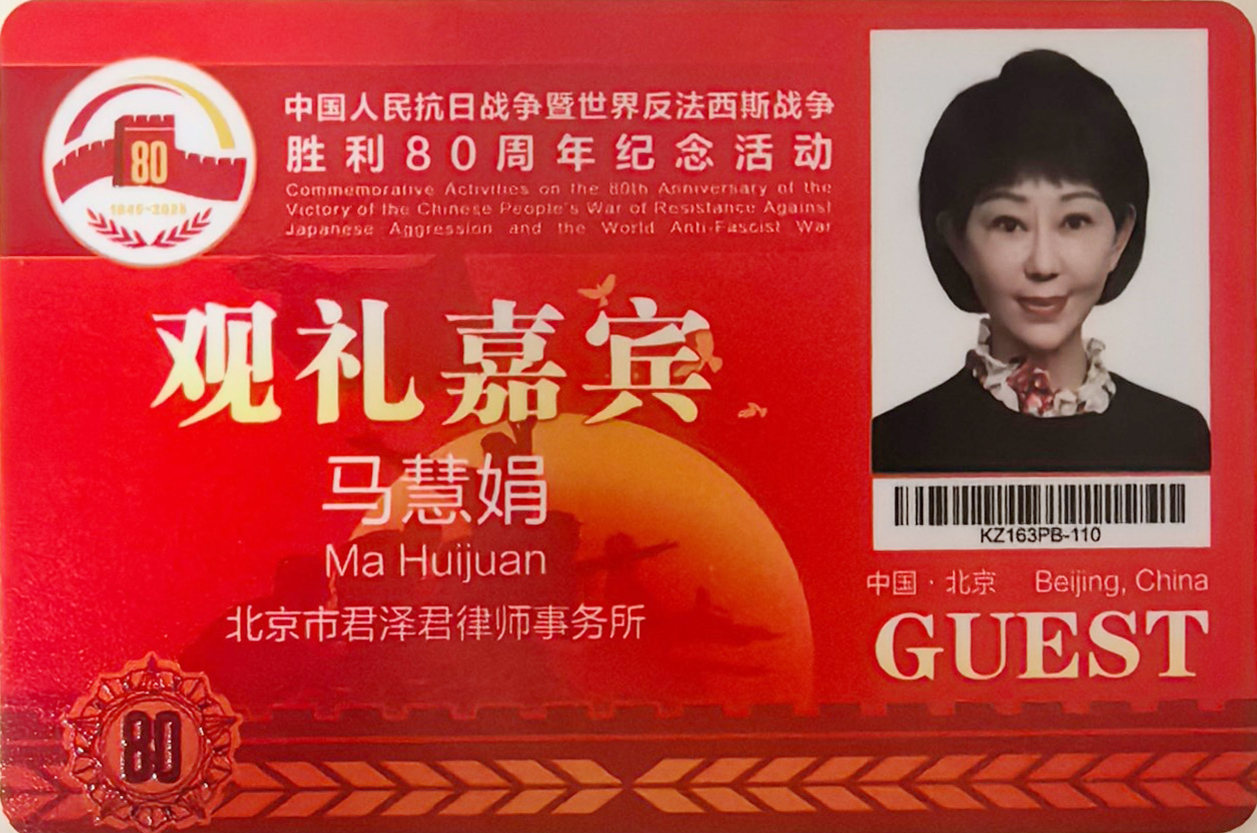 2025年9月3日上午,纪念中国人民抗日战争暨世界反法西斯战争胜利80周年大会在北京天安门广场隆重举行。北京市人大代表、北京市君泽君律师事务所高级合伙人马慧娟律师受邀参加阅兵观礼活动,现场见证了这一庄严而神圣的时刻。