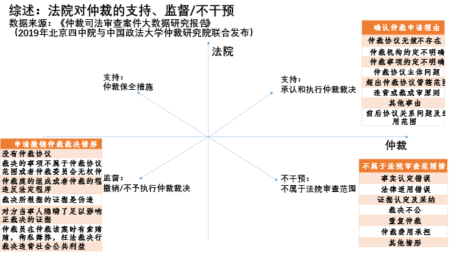 司法审查是临时/专设仲裁右边的“书挡”。 根据2019年北京市四中院和中国政法大学仲裁研究院联合发布的《仲裁司法审查案件大数据研究报告》[1],笔者将外部监管和司法审查归纳为: