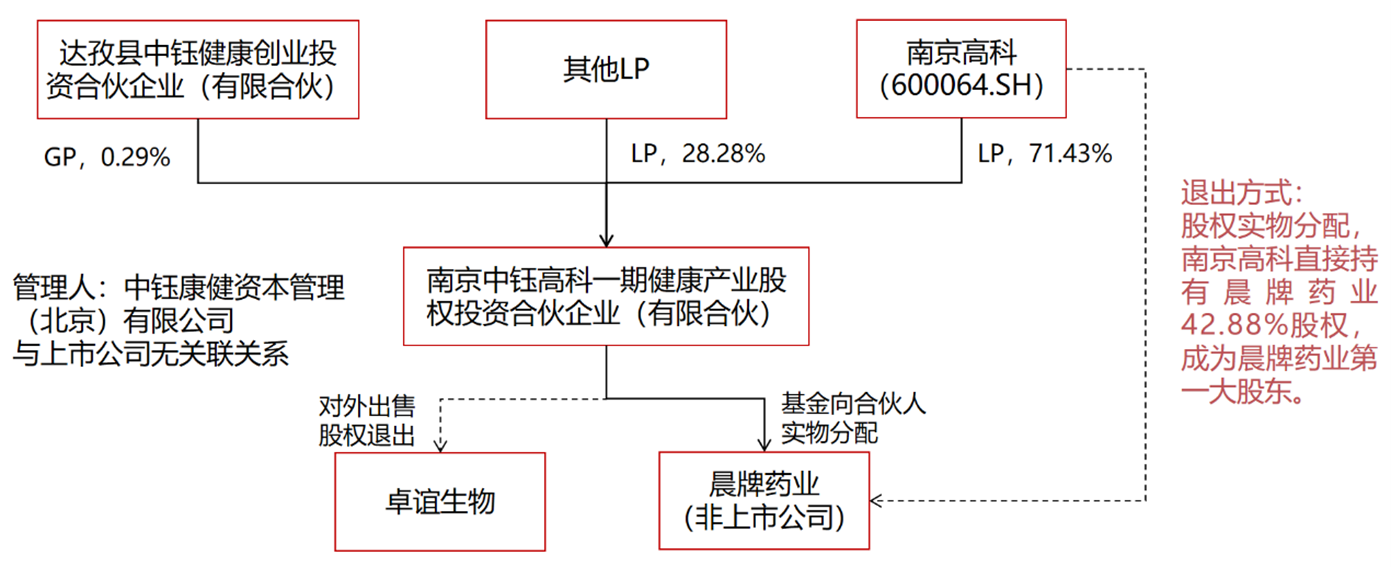 2024年,基金存续期届满后,因晨牌药业股份短期内无法按预期转让变现,且基金已无其他投资标的,上市公司通过退伙方式退出基金,并以实物分配方式取得晨牌药业42.88%股份,具体方式为:“基金将其持有的晨牌药业33,020,833股股份按照上市公司实缴出资比例向上市公司进行实物分配,该实物分配通过上市公司与基金签署关于晨牌药业的股份转让协议的方式实施,由于本次股份转让的实质为基金根据合伙人会议决议向上市公司退还其享有的财产份额的实物分配,因此双方同意本次股份转让上市公司无需支付任何股份转让款”。根据上市公司公告,股份实物分配后,上市公司成为晨牌药业第一大股东,后续直接参与晨牌药业的经营管理并控制公司经营和财务。
