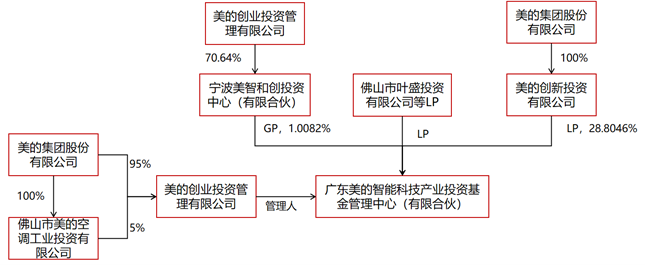 2019年,宁波美智和创投资中心(有限合伙)作为GP,与上市公司全资子公司美的创新投资有限公司、宁波普罗非投资管理有限公司等LP,共同出资设立广东美的智能科技产业投资基金管理中心(有限合伙)。美的资本担任基金管理人,并为基金组建投资决策委员会,享有基金投资管理决策权。基金设立之初,上市公司子公司美的创新投资有限公司出资3亿元(出资比例42.25%),2020年追加出资3亿元,合计出资6亿元(出资比例为29.51%),基金规模最终为20.83亿元。