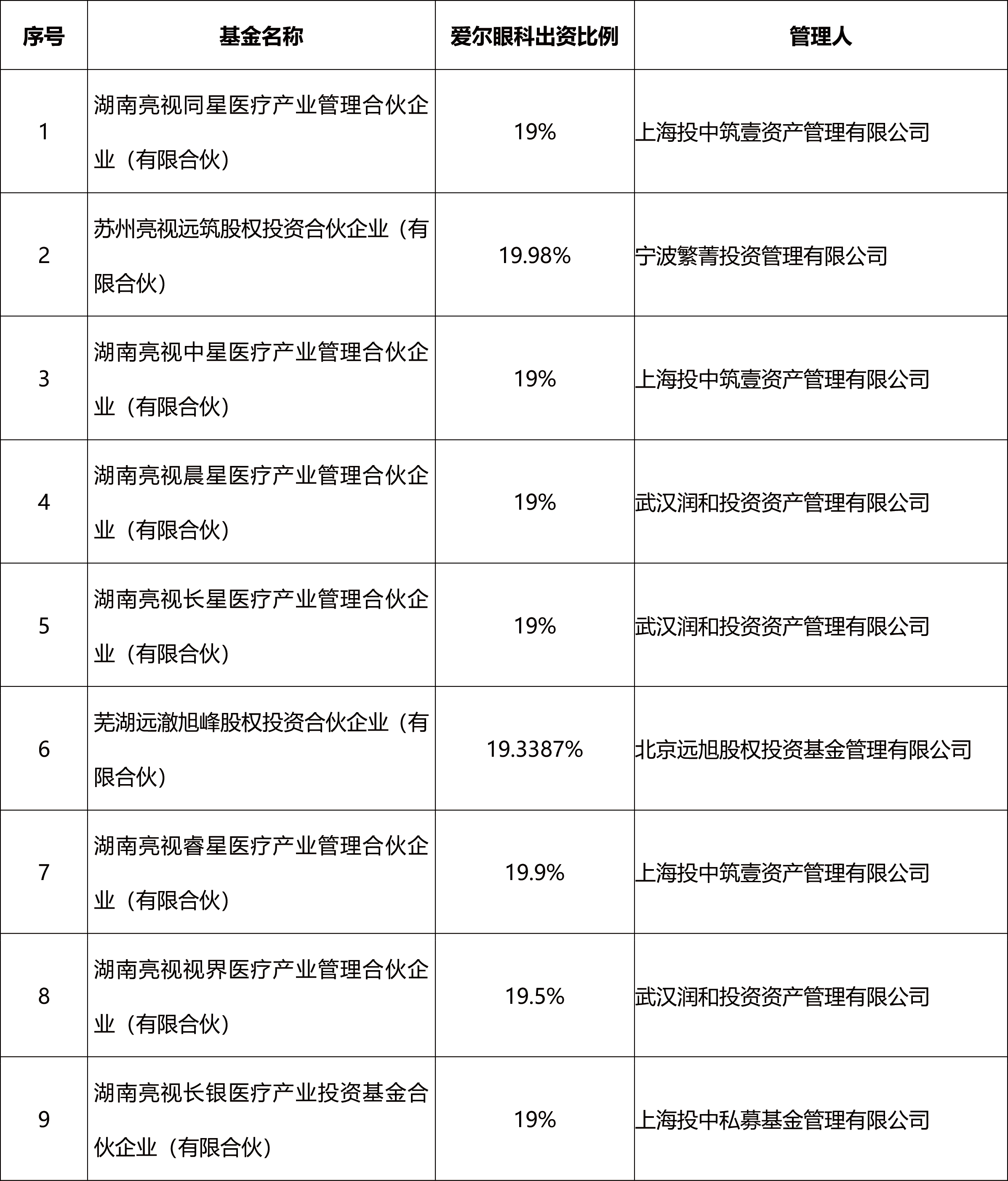 根据爱尔眼科2024年年度报告,截至2024年末,爱尔眼科及拉萨亮视创业投资有限公司等子公司仍持有9只境内产业并购基金,爱尔眼科出资比例均介于19%-20%之间,基金管理人均为外部机构,多数出资由管理人对外募集,投资人涵盖产业投资人及保险公司、证券公司等金融机构。该等基金的基本信息如下: