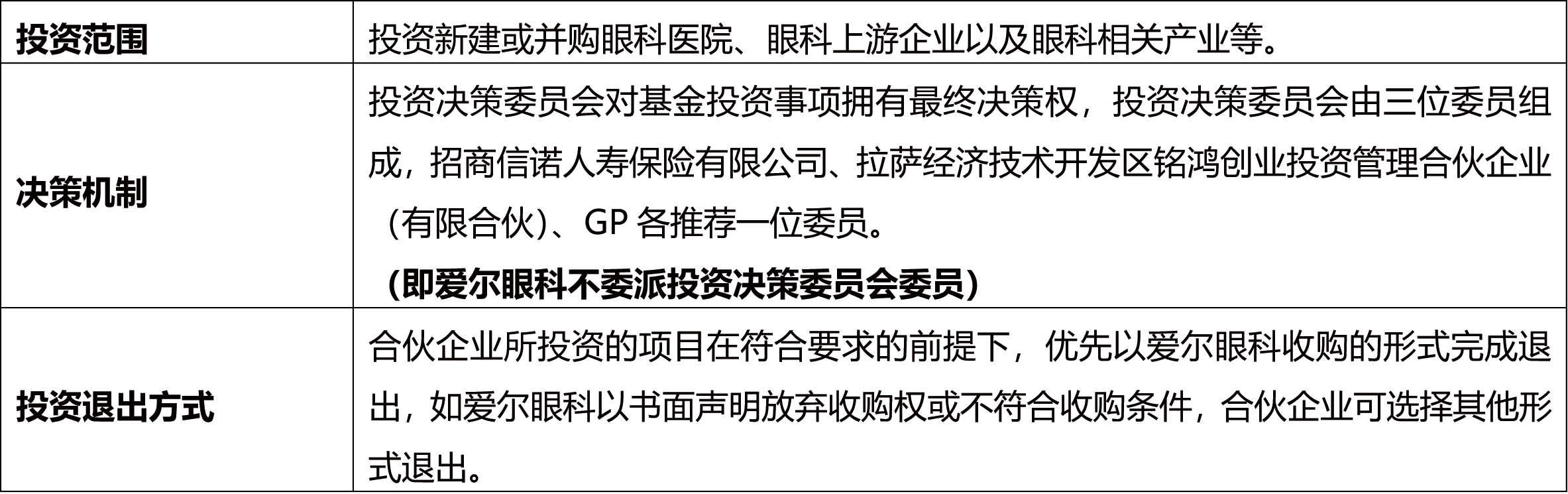 2019年,北京远旭股权投资基金管理有限公司(与上市公司无关联关系)作为GP和私募基金管理人,与爱尔眼科下属子公司拉萨亮视创业投资有限公司及招商信诺人寿保险有限公司、渤海人寿保险股份有限公司、中银三星人寿保险有限公司、拉萨经济技术开发区铭鸿创业投资管理合伙企业(有限合伙)等LP,共同出资设立远翔天祐基金,基金募集规模8亿元,其中爱尔眼科出资1.59亿元,出资比例为19.875%,其他LP出资比例合计约80%。基金核心要素如下:
