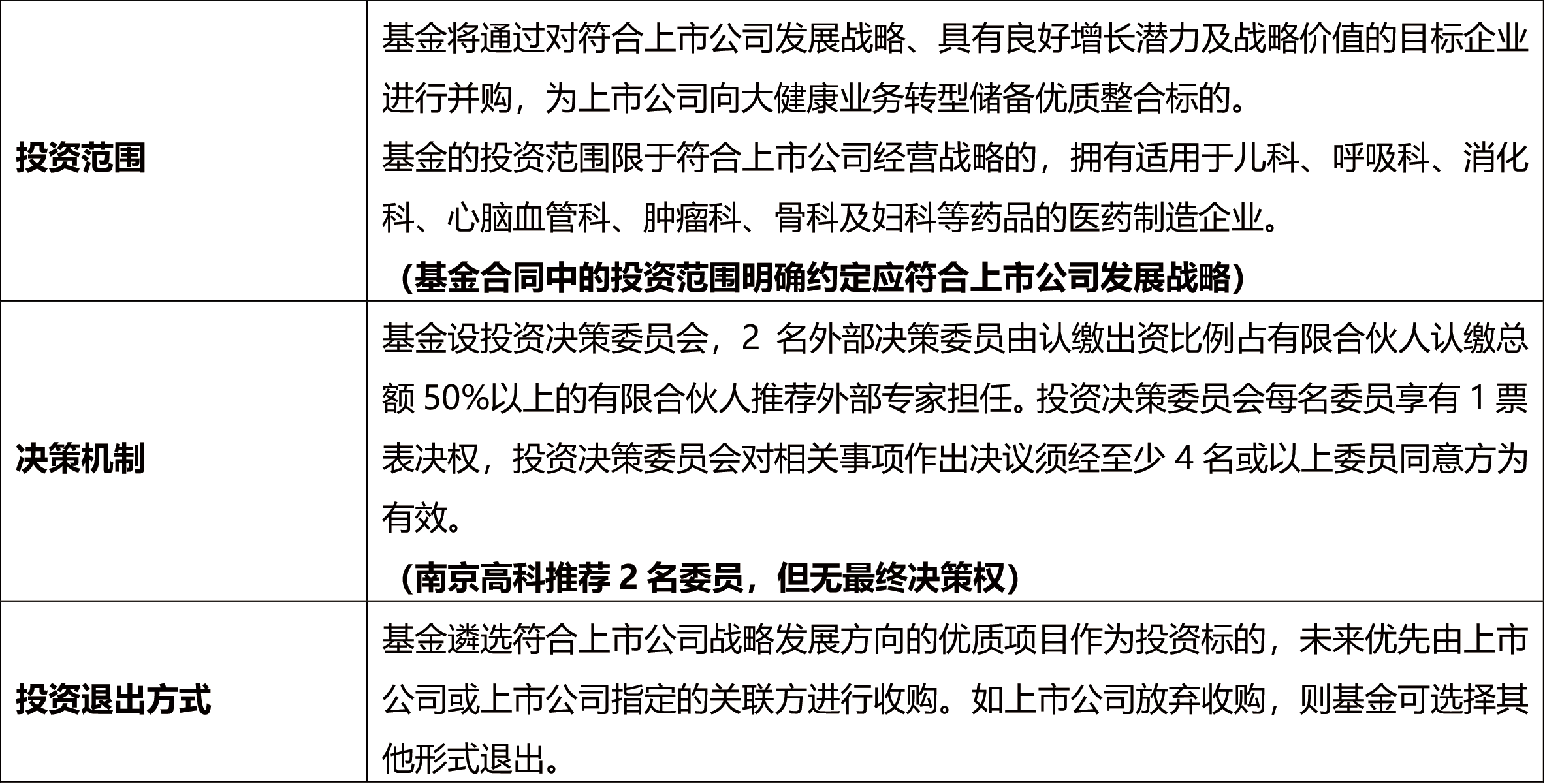 2015年,达孜县中钰健康创业投资合伙企业(有限合伙)作为GP,与南京高科及其他LP共同出资设立南京中钰高科一期健康产业股权投资合伙企业(有限合伙)(以下简称“中钰高科并购基金”)。基金认缴出资总额为70,000万元,GP认缴出资200万元;南京高科作为LP认缴出资额50,000万元,出资比例为71.43%;其他LP认缴出资额合计19,800万元,出资比例28.29%。GP委托其关联方中钰康健资本管理(北京)有限公司作为私募基金管理人。基金核心要素如下: