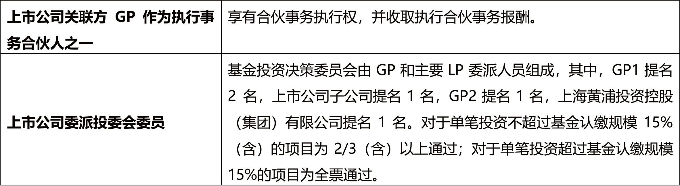 该基金采用“双GP”架构:GP1和管理人为国泰君安创新投资有限公司,GP2为上海商投创业投资有限公司,其系上市公司控股股东的全资子公司,属于上市公司关联方。上市公司向基金投委会委派委员参与决策事宜,关联方GP参与合伙事务执行,具体安排如下: