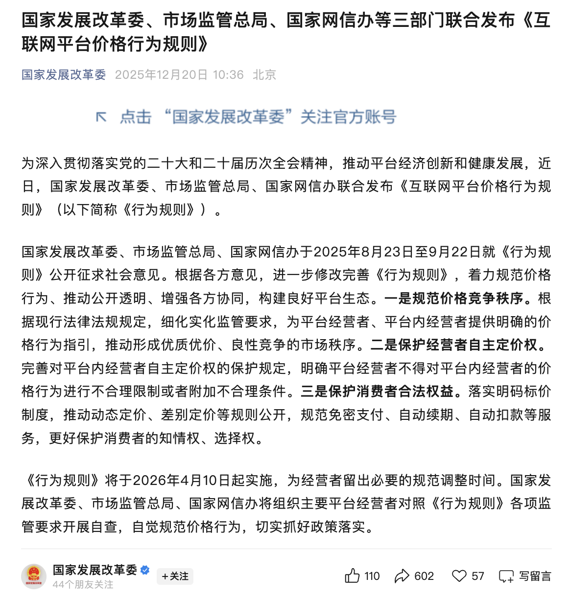 《行为规则》将于2026年4月10日起实施,为经营者留出必要的规范调整时间。国家发展改革委、市场监管总局、国家网信办将组织主要平台经营者对照《行为规则》各项监管要求开展自查,自觉规范价格行为,切实抓好政策落实。(来源:国家发展改革委微信公众号)