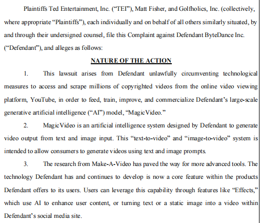 本案原告方由多家知名内容创作机构组成。根据诉状,原告方认为字节跳动和Meta涉嫌绕过YouTube平台的技术防护机制,非法获取海量视频数据,以此支撑其“文生视频”AI模型的迭代训练。通过这些模型,用户只需输入简单的文字描述,即可生成高质量的视频内容。原告方认为,这种商业模式建立在非法榨取创作者劳动成果的基础之上。