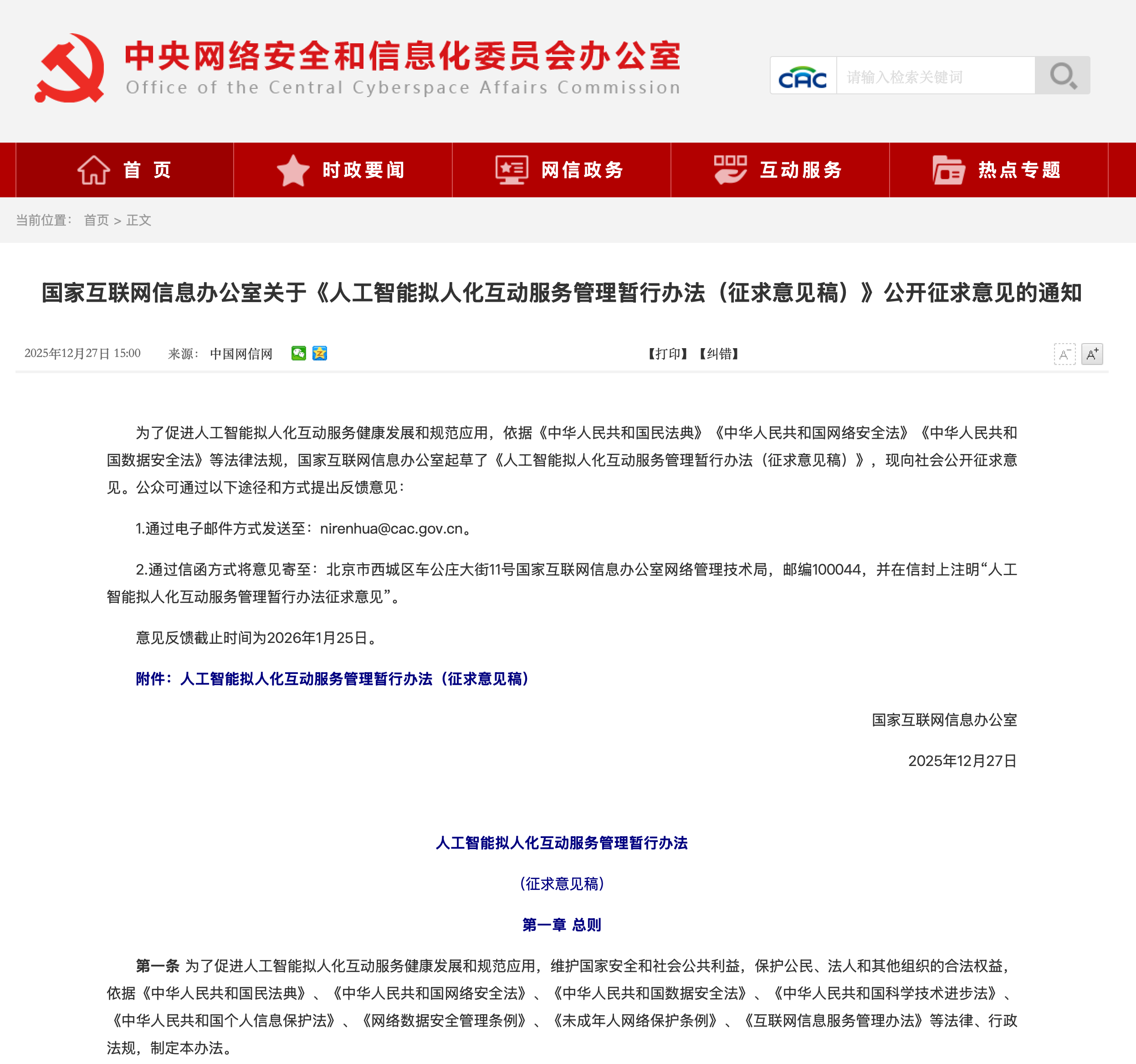 4、国家网信办发布关于《人工智能拟人化互动服务管理暂行办法(征求意见稿)》公开征求意见的通知