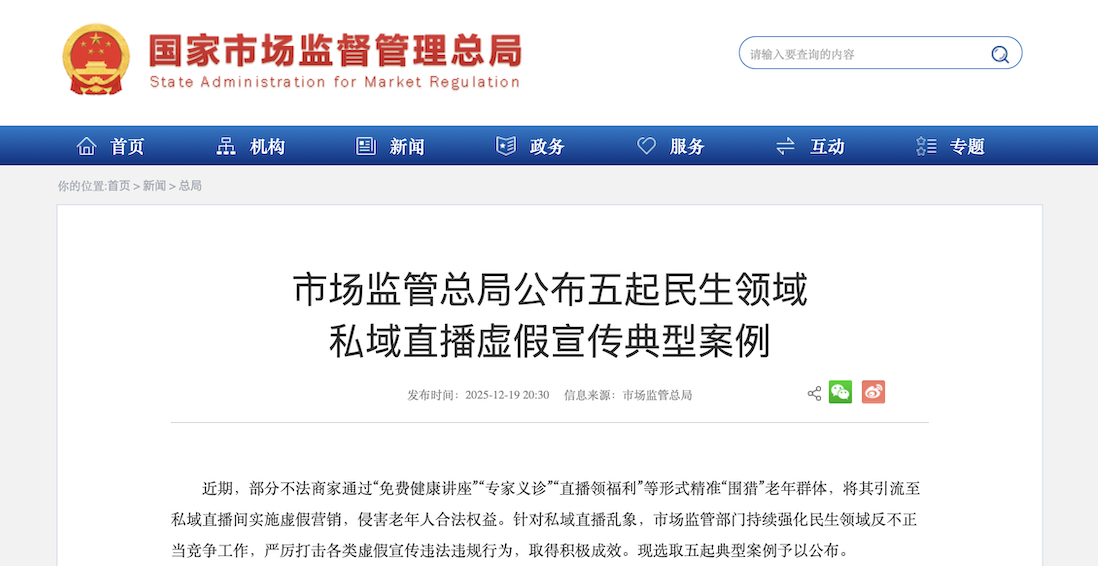 8、市场监管总局公布五起民生领域私域直播虚假宣传典型案例