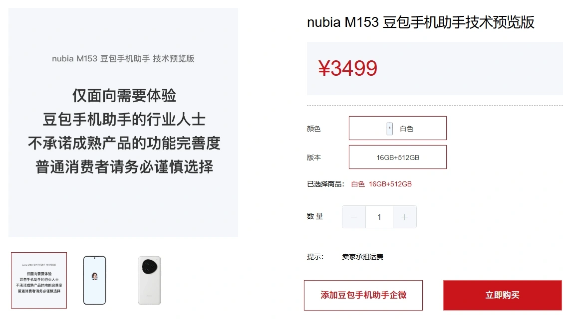 12月1日,中兴通讯在官微上表示,搭载豆包手机助手技术预览版的工程样机努比亚M153少量发售,而在此之前,豆包曾多次辟谣与中兴共同开发手机产品。根据中兴商城公布的价格,上述手机起售价为3499元。豆包方面表示,目前没有自研手机的计划,而是正与多家手机厂商洽谈,以“生态合作”的形式将豆包手机助手整合进不同品牌的机型中,相关进展将在后续公布。与上一次辟谣不同的是,在这一次,豆包主动披露了合作范围和对象,并展示了合作场景,比如豆包助手可根据用户指令在多款应用间自动跳转,完成类似查票订票、商品下单、批量下载文件、多软件物流进度一键查询等任务。