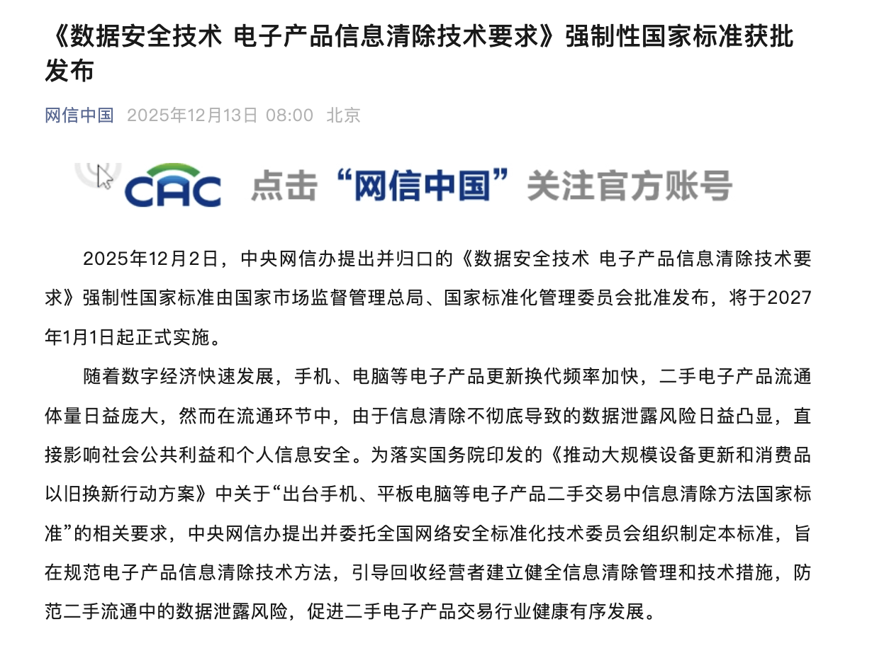 2025年12月2日,中央网信办提出并归口的《数据安全技术 电子产品信息清除技术要求》强制性国家标准由国家市场监督管理总局、国家标准化管理委员会批准发布,将于2027年1月1日起正式实施。随着数字经济快速发展,手机、电脑等电子产品更新换代频率加快,二手电子产品流通体量日益庞大,然而在流通环节中,由于信息清除不彻底导致的数据泄露风险日益凸显,直接影响社会公共利益和个人信息安全。为落实国务院印发的《推动大规模设备更新和消费品以旧换新行动方案》中关于“出台手机、平板电脑等电子产品二手交易中信息清除方法国家标准”的相关要求,中央网信办提出并委托全国网络安全标准化技术委员会组织制定本标准,旨在规范电子产品信息清除技术方法,引导回收经营者建立健全信息清除管理和技术措施,防范二手流通中的数据泄露风险,促进二手电子产品交易行业健康有序发展。(来源:网信中国微信公众号)