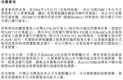 1月21日,邵氏兄弟(00953.HK)公告宣布拟收购其主要股东华人文化(CMC Inc.)旗下核心影视资产。公告显示,邵氏兄弟公司与主要股东华人文化订立买卖协议,公司拟以发行代价股份方式收购CMC Moon Holdings所持业务,交易对价达45.765亿元人民币(约合50.98亿港元)。目标业务包括剧集制作龙头正午阳光、电影投资制作公司上海华人影业、海外发行业务CMC Pictures及超过50家以UME品牌运营的影院网络等。其中,正午阳光曾制作出品《琅琊榜》《大江大河》《山海情》《知否知否应是绿肥红瘦》等热门剧集,具有行业标杆意义。