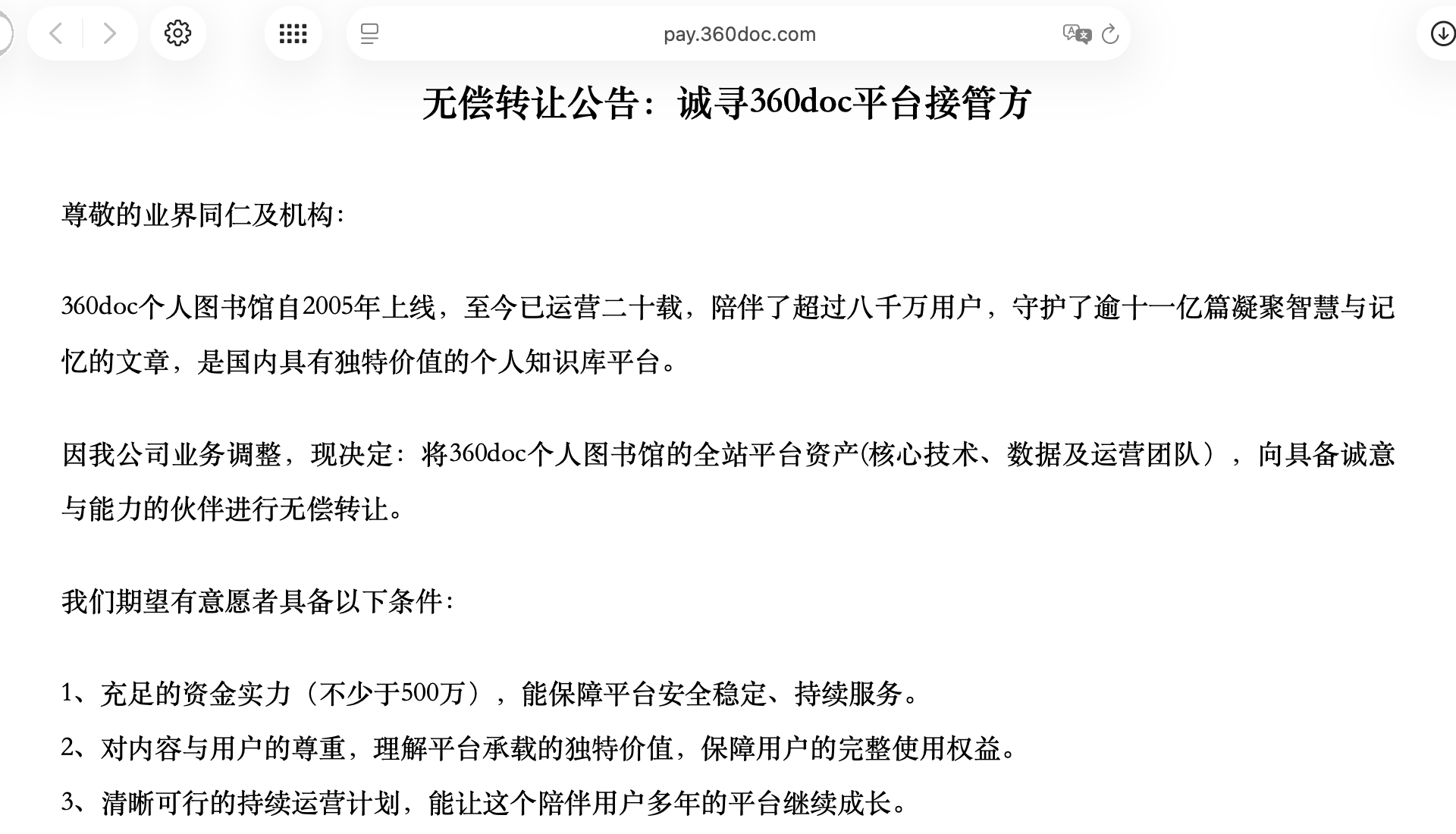 根据360doc个人图书馆1月24日发布的公告,因公司业务调整,现决定将360doc个人图书馆的全站平台资产(核心技术、数据及运营团队),向具备诚意与能力的伙伴进行无偿转让。公告中还列出了360doc个人图书馆团队期望有意愿者具备的条件,其中包括充足的资金实力(不少于500万元),能保障平台安全稳定、持续服务;对内容与用户的尊重,理解平台承载的独特价值,保障用户的完整使用权益;清晰可行的持续运营计划,能让这个陪伴用户多年的平台继续成长。