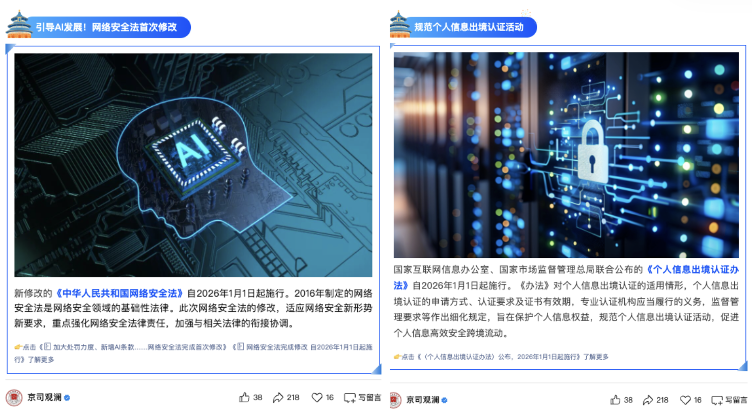 新修改的《中华人民共和国网络安全法》与国家互联网信息办公室、国家市场监督管理总局联合公布的《个人信息出境认证办法》均自 2026年1月1日起正式施行。作为网络安全领域的基础性法律,2016 年制定的《网络安全法》经此次修改,适应网络安全新形势新要求,重点强化网络安全法律责任,加强与相关法律的衔接协调;而《个人信息出境认证办法》则对个人信息出境认证的适用情形、申请方式、认证要求等作出细化规定,旨在保护个人信息权益,规范个人信息出境认证活动,促进个人信息高效安全跨境流动,二者共同构成网络空间安全与个人信息跨境治理的重要法治保障,协同筑牢网络安全与数据权益保护的双重防线。(来源:京司观澜微信公众号)