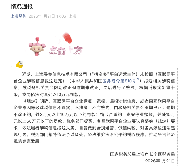 1月21日,“拼多多”运营者上海寻梦信息技术有限公司因未按照《互联网平台企业涉税信息报送规定》报送相关涉税信息,被税务机关责令限期改正但逾期未改正,遭受了十万元处罚。依据前述规定,互联网平台企业瞒报、谎报、漏报涉税信息,或者因互联网平台企业原因导致涉税信息不真实、不准确、不完整的,由税务机关责令限期改正;逾期不改正的,处2万元以上10万元以下的罚款;情节严重的,责令停业整顿,并处10万元以上50万元以下的罚款。(来源:上海税务微信公众号)