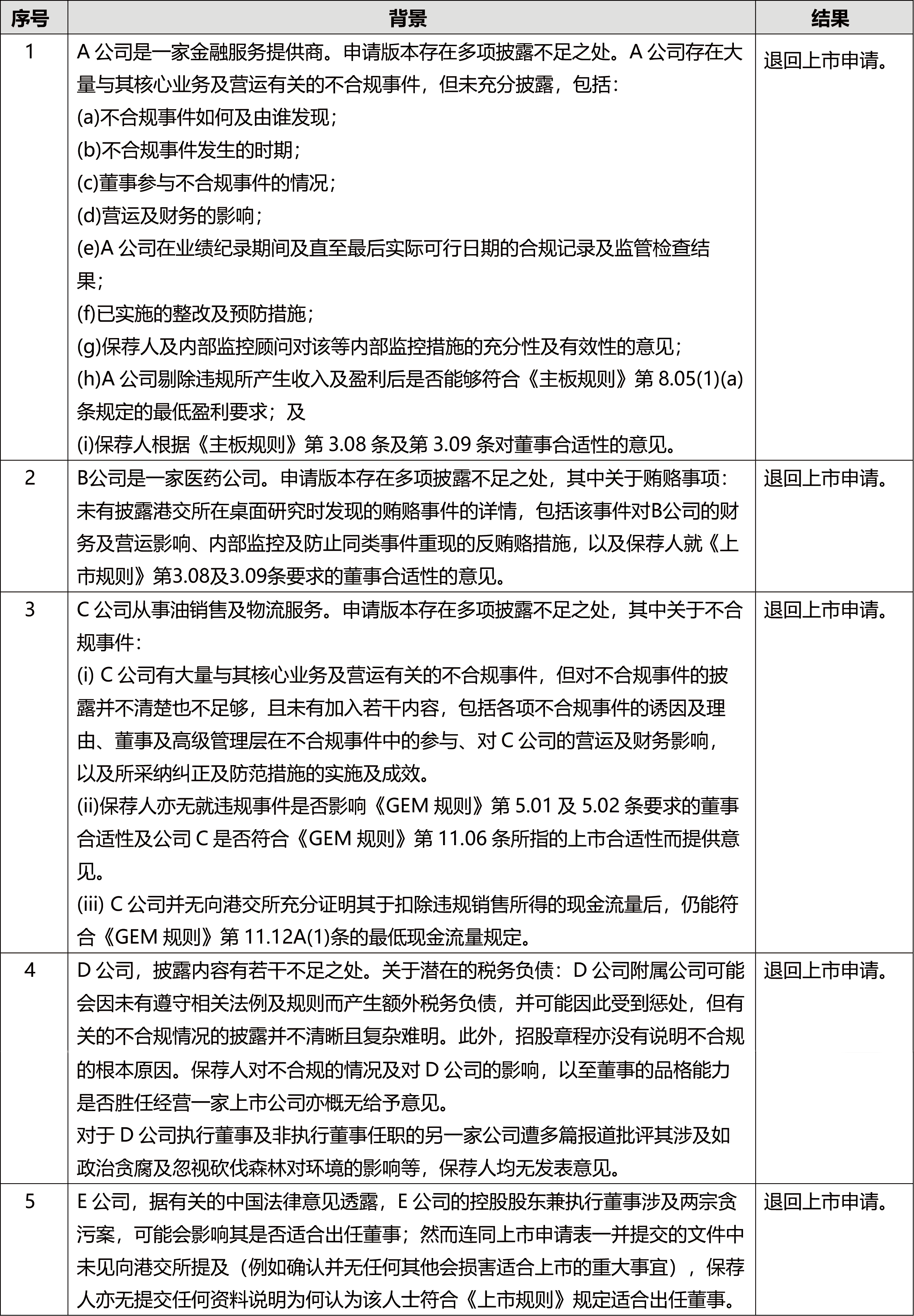 港交所历年发布的上市决策以及《新上市申请指南》等文件,刊发了因不合规情形被拒绝和被退回的上市申请案例。