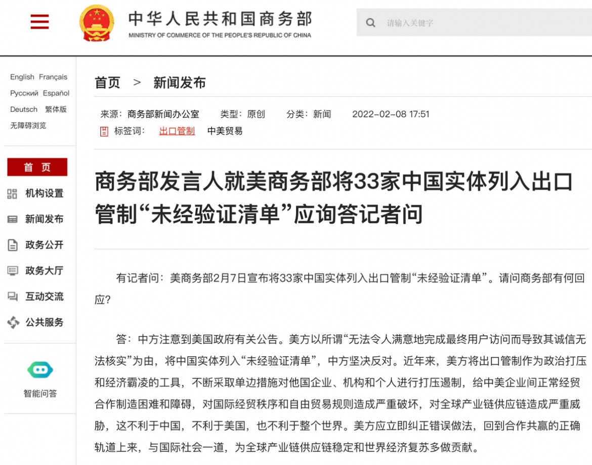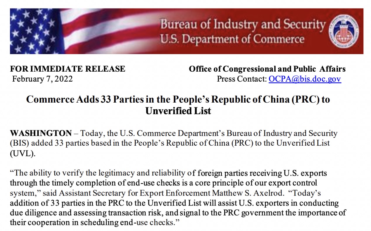美国当地时间2022年2月7日,美国商务部产业与安全局(BIS)在其官网宣布将中国33个实体列入未核实清单(Unverified List,以下简称“UVL”),美国负责出口执法事务的助理部长Matthew S. Axelrod在公告中表示“今天将中国的 33 个实体添加到未核实名单中,将有助于美国出口商进行尽职调查和评估交易风险,并向中国政府表明他们在安排最终用途检查方面合作的重要性”。[1]次日,BIS在美国《联邦政府公报》(Federal Register)上正式公布了被列入UVL的33个中国实体的信息。对此,中国商务部发言人表示坚决反对,并指责美国“将出口管制作为政治打压和经济霸凌的工具,不断采取单边措施对他国企业、机构和个人进行打压遏制,给中美企业间正常经贸合作制造困难和障碍,对国际经贸秩序和自由贸易规则造成严重破坏,对全球产业链供应链造成严重威胁”。[2]